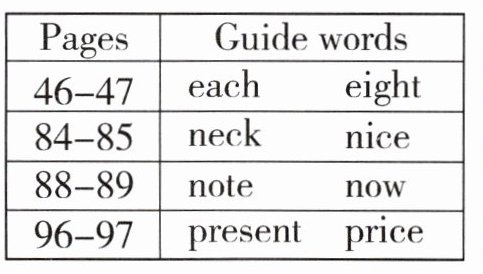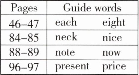 答案:3. B 解析:字典中 guide words(眉题词)决定单词所在页码,“noble”的拼写应介于对应眉题词 nice 和 note 之间,结合选项,其对应页码为 86—87,故选 B。