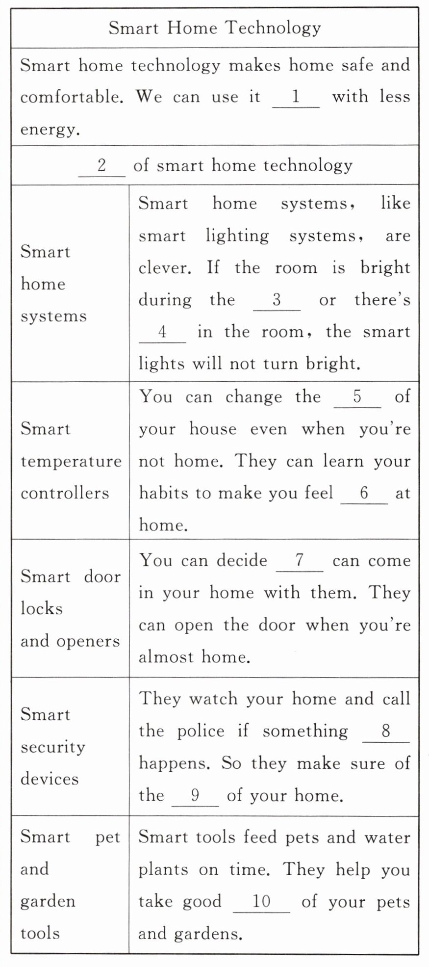 2. Examples 解析:表格下方列举了各类智能家居技术,结合原文“For example”,可知此处指智能家居技术的例子,且首字母大写,故填 Examples。