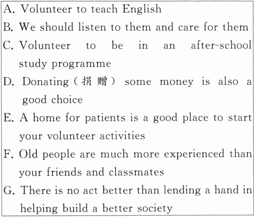 2. E 解析:根据上文“Volunteer in a nursing home”可知,此处应介绍在疗养院做志愿者。E选项“疗养院是开始志愿者活动的好地方”符合语境。故选E。
