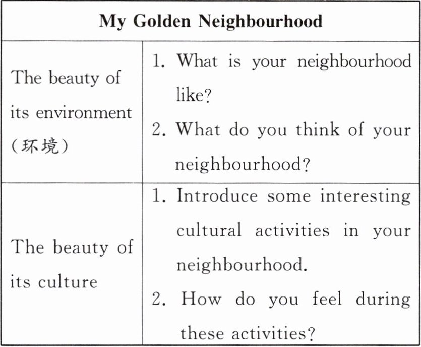 答案:My neighbourhood is a lively and friendly place. In the centre of the neighbourhood, there is a beautiful park. Everyone greets each other with warm smiles every day.第一段开篇点题,点明环境之美和人之美。I love my neighbourhood because it is warm and fun. Neighbours often chat in the parks or try to help each other in their free time. Some interesting cultural activities in my neighbourhood make it special. Every autumn, we hold a Folk Art Festival. People gather to make traditional crafts like paper - cuts or lanterns. These activities teach us teamwork and keep our traditions alive.第二段详写人之美,融合文化之美。During these events, I always feel happy and proud. Our golden neighbourhood isn't just a place to live—it's a home filled with love and joy.第三段抒发情感,总结三种美的核心价值。