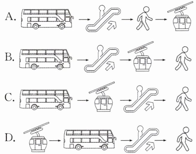 2. B 解析:图示理解题。根据文章第三段可知正确顺序为:乘坐6分钟的观光巴士(scenic bus)→乘坐电梯(lift)上升268米→乘坐缆车(cable car)向上攀升200多米→步行1公里(1 - kilometre walk)。故选B。