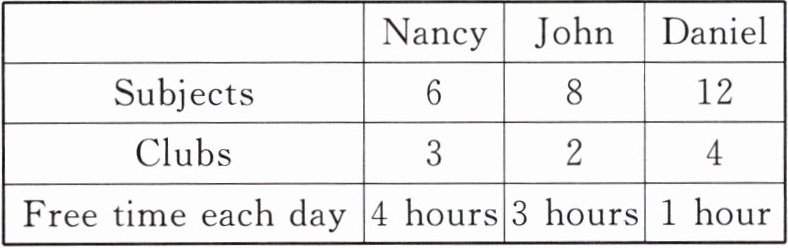 答案:5. D 解析:A项Nancy有6门课,Daniel有12门,Nancy不是最多;B项Daniel参加了4个俱乐部,是最多;C项Daniel每天有1小时空闲时间,比Nancy的4小时少;D项John每天有3小时空闲时间,比Nancy的4小时少,正确,故选D。