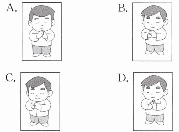 3. B 解析:图示理解题。根据"The Fist-and-Palm Salute is another type of Yi Li, with the fist's right hand covered by the left hand."可知,抱拳礼为右手握拳、左手覆于其上,图片需体现左手在上、右手在下的动作。选项中仅 B 符合描述。故选 B。