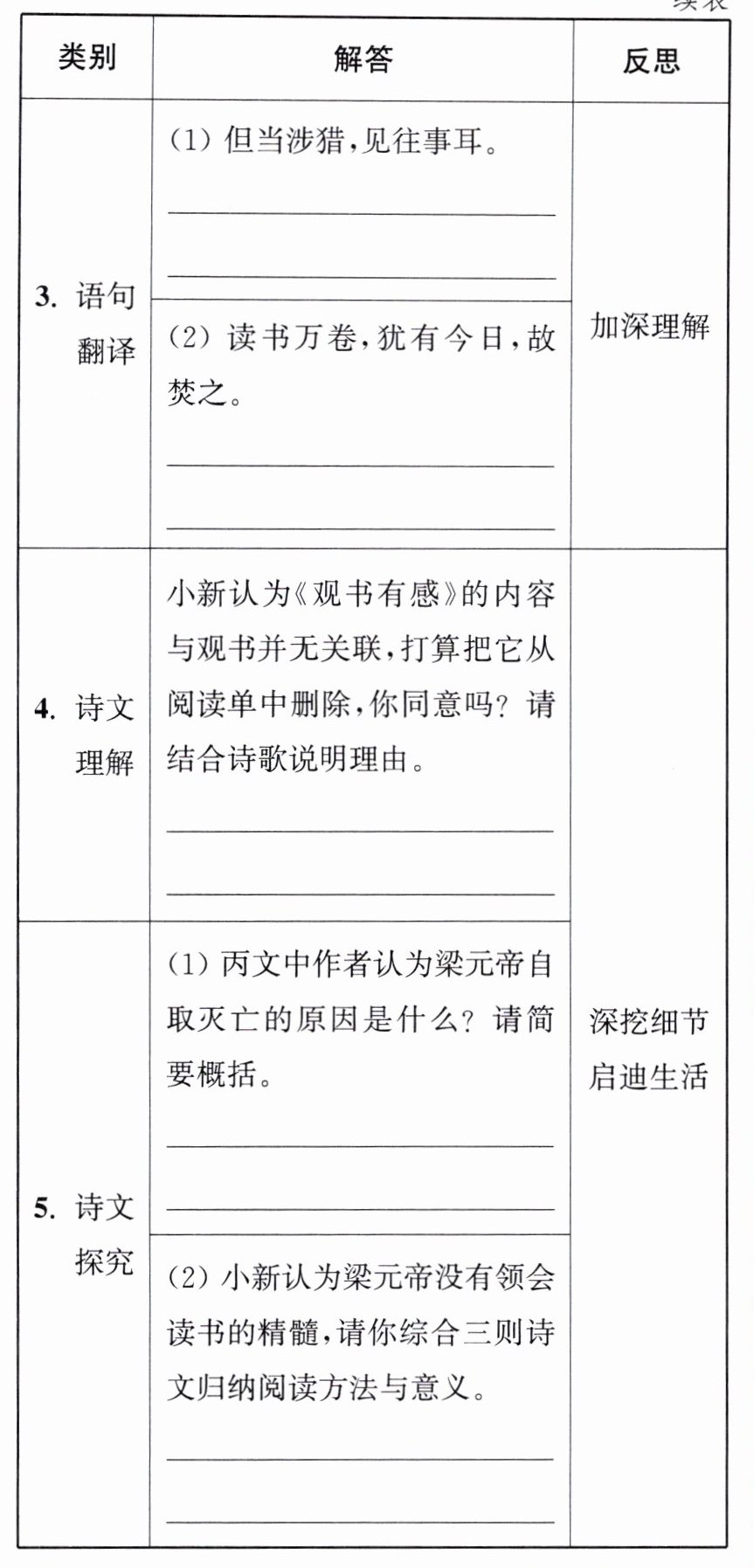 答案:1. (1) 用在主谓之间,取消句子独立性,不译 (2) 夸耀 (3) 在 (4) B 2. 义不能振/机不能乘/则与耽酒渔色也/又何以异哉 3. (1) 只是应当粗略地阅读,了解历史罢了。 (2) (我)读了万卷书,仍然落到今天(的下场),所以焚烧它们。 4. 不同意。《观书有感》(其二)以“蒙冲巨舰”在春水上涨时“自在行”,对比往日“枉费推移力”,暗喻读书如积水,积累到一定程度便能豁然贯通。诗歌借自然现象喻读书道理,并非直接写“观书”,但巧妙以哲理关联阅读,应保留。 5. (1) 梁元帝专注堆砌华丽词句以炫耀博学,却在国难时不懂运用书中大义救国,将精力耗于形式化阅读,如同沉溺酒色,最终误国。 (2) 方法:需“涉猎”以广见闻(如吕蒙),更要辨明大义、洞察微言,避免困于字句(如梁元帝反面案例)。 意义:积累如“春水生”可促豁然贯通(朱熹诗),读书应服务于修己治人、经世致用,而非空谈炫博。
