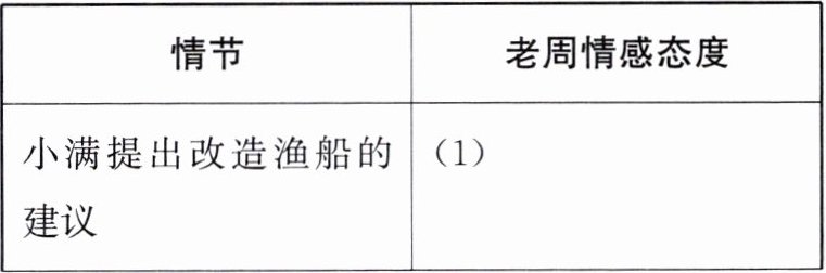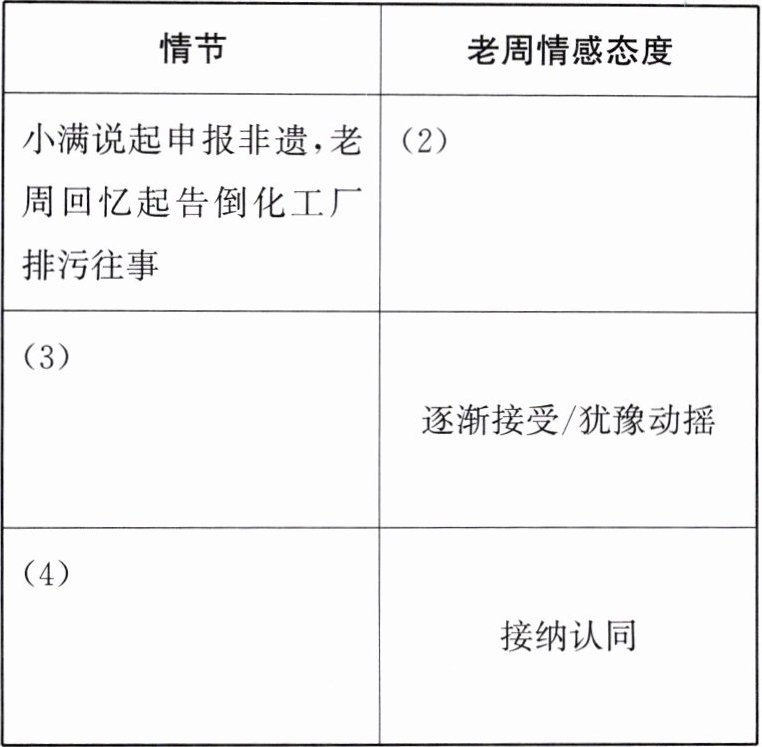 答案:1. (1) 坚决反对 (2) 有所触动 (3) 老周跟着小满进村委会看“胥河生态旅游规划图” (4) 小满接到非遗传承人补助获批的电话 2. 示例:周小满具有示范带头作用。他积极推动乡村旅游开发,劝说父亲参与“渔家乐”项目;注重乡村生态保护,带领社团告倒化工厂;努力申报非遗,争取补助,促进乡村文化传承,是“乡村振兴”的优秀青年代表。 3. (1) 期待 (2) 传统与现代在乡村发展中和谐融合 (3) 老周想起前年冬天化工厂偷排废水,小满带着社团告倒化工厂 4. 表层指渔船上的灯火及胥河发展的新变化;深层象征胥河在乡村振兴中保留传统又融入现代,焕发新活力。