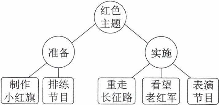示例:活动围绕红色主题分“准备”和“实施”两个阶段。在准备阶段,要制作小红旗,排练节目;在活动实施阶段,要重走长征路、看望老红军,最后表演节目。