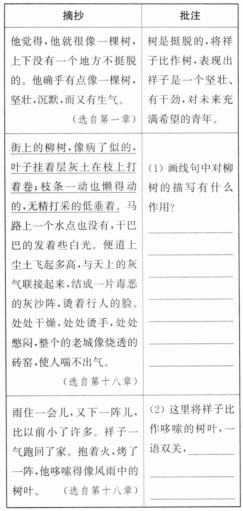 4. “圈点与批注”是很好的阅读方法,小语整理了《骆驼祥子》中有关“树”的描写,请你将笔记补充完整。