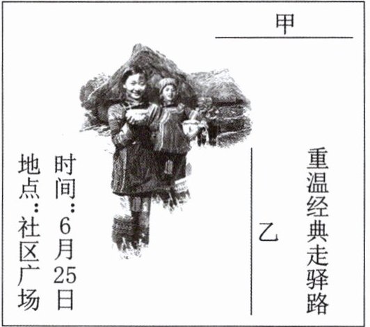 (2)根据上联“重温经典走驿路”,在乙处填写下联,来宣传课本剧表演的目的与意义。