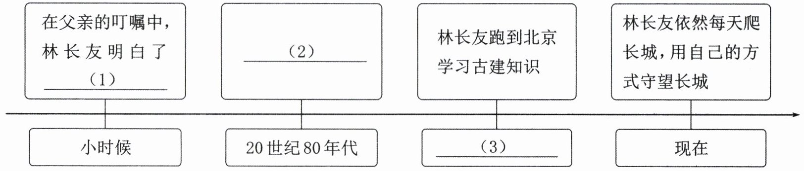。答案:15. (1)要阻止他人破坏长城(或:保护长城的重要性) (2)开始接触修缮长城的活计 (3)窥了门径之后