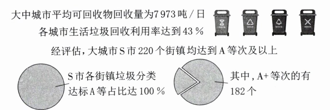 答案:10. ① 2024年,各城市保持垃圾分类的良好态势,每月达标率逐步提高;② 大中城市可回收物回收量大,生活垃圾回收利用率接近一半;③ 大城市 S 市各街镇评估成绩优异。(写出两点即可)