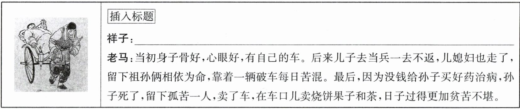 6. 小语以"探究老北京洋车夫"为主题对《骆驼祥子》进行研读,他准备把探究成果汇编在幻灯片中。下面是其中一张幻灯片,请你和小语一起完成。(7分)