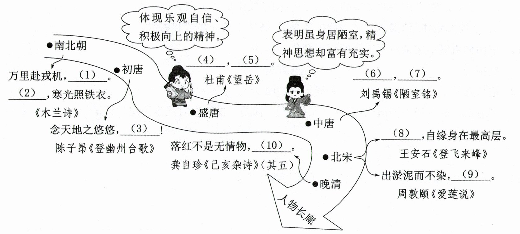 答案:(1) 关山度若飞 (2) 朔气传金柝 (3) 独怆然而涕下 (4) 会当凌绝顶 (5) 一览众山小 (6) 斯是陋室 (7) 惟吾德馨 (8) 不畏浮云遮望眼 (9) 濯清涟而不妖 (10) 化作春泥更护花