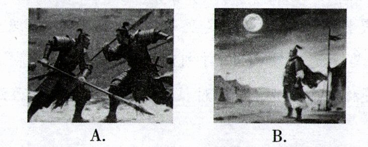 图(填字母),理由:示例:诗的前两句描绘了将军在营帐之外,明月高悬,猎猎西风吹动着他的战袍的画面,展现出一位在月夜中于营外,受西风吹拂,尽忠职守、英武威严的戍边将领形象。因此图 B 中的画面更符合本诗的内容。