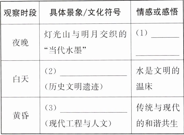 答案:1. (1) 沉醉于夜色的深邃与轻盈(或:惊叹于当代水墨般的夜景之美) (2) 长阳人化石、商周青铜罍、战国虎钮铜錞于等历史文物 (3) 三峡大坝与屈原祠相映 2. 示例一:运用比喻的修辞手法,将航标船比作飞纸帆,生动形象地写出航标船在江面光影中轻盈摇曳的姿态。“细碎的光”与“风声、人声”等相映衬,以动衬静,展现出宜昌夜色中动与静交融的和谐之美,流露出作者对夜景的沉醉与喜爱。 示例二:从感官角度描写,“晃出细碎的光”是视觉,“风声、人声”是听觉,“静默的呼吸”是触觉(或:想象),多感官结合,细腻地描绘出夜晚江面的灵动与静谧,让读者身临其境感受宜昌夜色的丰富与美好。 3. 示例:“水库里有人拖着‘跟屁虫’游泳,斜阳落进水波,光在跃动欢叫。”通过描写现代人在三峡水库中自在游泳的场景,以及斜阳波光的动态画面,间接抒发了作者对传统(屈原文化)与现代(三峡工程)和谐共生的欣慰,也暗含“山水与时间,终是抚平了所有伤痛”的豁达。 4. 在宜昌,像屈原等历史人物会消散,但他们的故事、他们的精神却永远存在,宜昌作为充满水的城市,将以水为载体,一面承载着悠久文明,一面跟随时代不断前行,保持文化传承与发展的永恒性。 5. 示例一:放入第五单元。理由:本文以“水之旅”为线索,记述宜昌日夜见闻(如灯光山、屈原祠、三峡大坝),融合山水描摹(江畔夜景)、人文追思(屈原)与时代感悟(高峡平湖),符合该单元的定位。 示例二:放入第一单元。理由:本文的核心在于通过宜昌的灯光山、历史遗迹(如青铜罍、屈原祠)、民俗场景(江边嬉戏、川鄂小调)等,展现宜昌独特的地域文化与人文风情。文中“这烟火气,是江雾里最亮的颜色”“水是文明的温床”等句,突出民俗与传统的价值,与第一单元的主题高度契合。