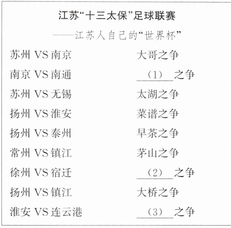 2. 从最开始官媒制造“名梗”之后,网友也自发“自下而上”开始二次加工、二次包装、二次推广。请你根据自己的文化积累把下面江苏“十三太保”足球联赛的“梗”补充完整。