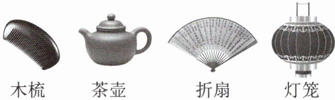 答案:9. (1) 示例一:木梳——你在发间轻轻掠过,如妈妈温柔的手指。 示例二:茶壶——茶香悠长,岁月静好。 示例三:折扇——闲看流云,轻摇时光。 示例四:灯笼——点亮节日,点亮吉祥,点亮幸福。