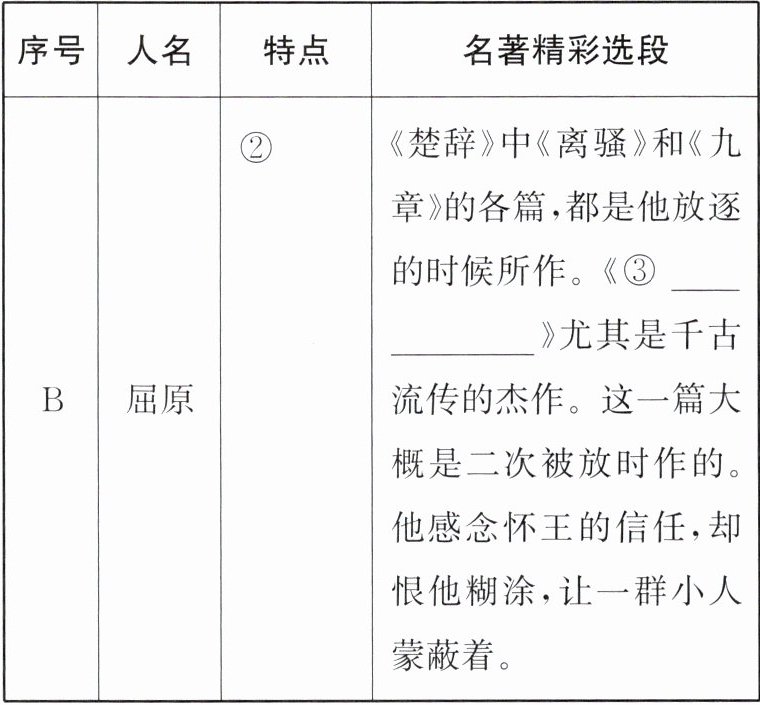 答案:(1)① 苏秦 ② 示例:爱国爱民、坚贞不屈、才华横溢(写出一点即可) ③ 离骚 (2)只图功名富贵,没有是非观念,只求揣摩主上的心理,拐弯抹角投其所好。 (3)示例:“谁用他们就帮谁”等句运用口语化的语言,通俗易懂、简洁明快地指出了纵横家“翻覆”的本性。