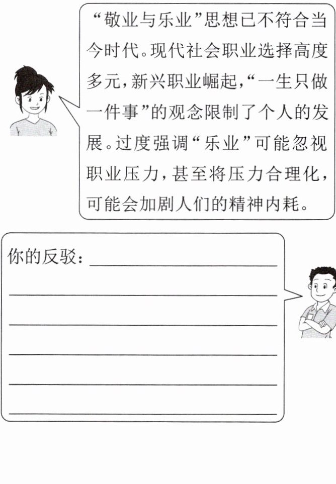10. (创意表达)学完《敬业与乐业》一课后,某班就“敬业与乐业是否已过时”开展辩论,下面是反方同学的观点,请你用课文《敬业与乐业》中的观点反驳她。