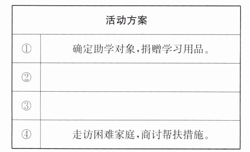 (2)[有行动]班级拟组织一次助学活动,请完成下面的活动方案。