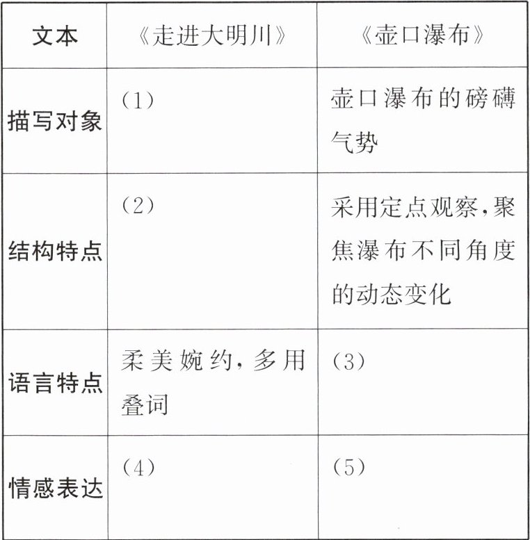 5. 本文与《壶口瀑布》都是写景佳作,但在内容和写法上有所不同,请完善下面的表格。
