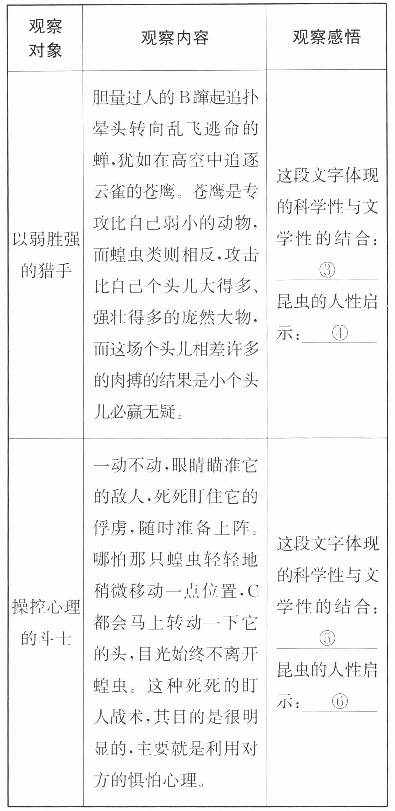 答案:5. (1)A:西班牙甲虫 B:绿蝈蝈 C:螳螂 (2)①通过细致描写西班牙甲虫小心翼翼守卵,不让其受外界伤害,展现母爱的无私伟大。②母爱的无私与伟大。③通过细腻观察,生动描绘绿蝈蝈胆量过人攻击蝉的场景,体现其捕食习性。④胆量过人,经过挫折才能取得成功。⑤通过描写螳螂眼睛瞄准敌人,盯住俘虏,生动展现其利用对方惧怕心理的盯人战术。⑥拥有强大的心理战术,能震慑敌人,能够让自己变得更加强大。