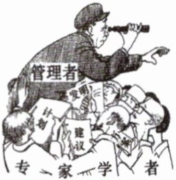 示例:(1)一群专家、学者围着一位管理者,并争先向他递上计划、方案、发明、建议。管理者拿着望远镜望向远处,看不到身边围着的人。