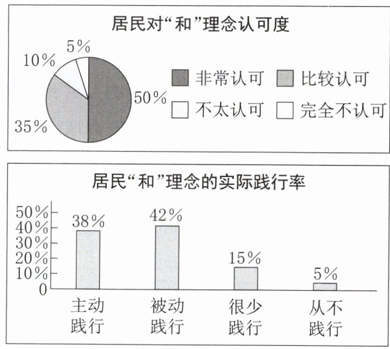 (2) ① 不超四成的居民会主动践行“和”理念;② 少部分人不认可、不践行“和”理念;③ 被动践行“和”理念的居民超四成,居民缺乏主动传承“和”文化的意识。(写出任意两点即可) (3) 小楚,别和你的妈妈“冷战”了。你的妈妈批评你是因为关心你的身体,怕你熬夜影响健康和学习效率,这是她爱你的表现。你觉得委屈是因为你也想努力学习,这没错,但“冷战”解决不了问题,还会让你们都难过,破坏家庭和谐。你可以找个时间,心平气和地和你的妈妈聊聊,说说你的想法,也听听她的意见。然后一起制订一个合理的学习计划,比如提高白天的学习效率,晚上早点休息,这样既能好好学习,又能让你的妈妈放心,你们的关系也会更和谐。