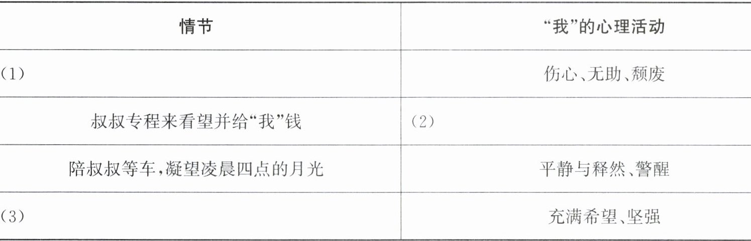 答案:15. (1) 父亲遽然离世 (2) 温暖、感动 (3) 看到叔叔离开,邮车渐行渐远