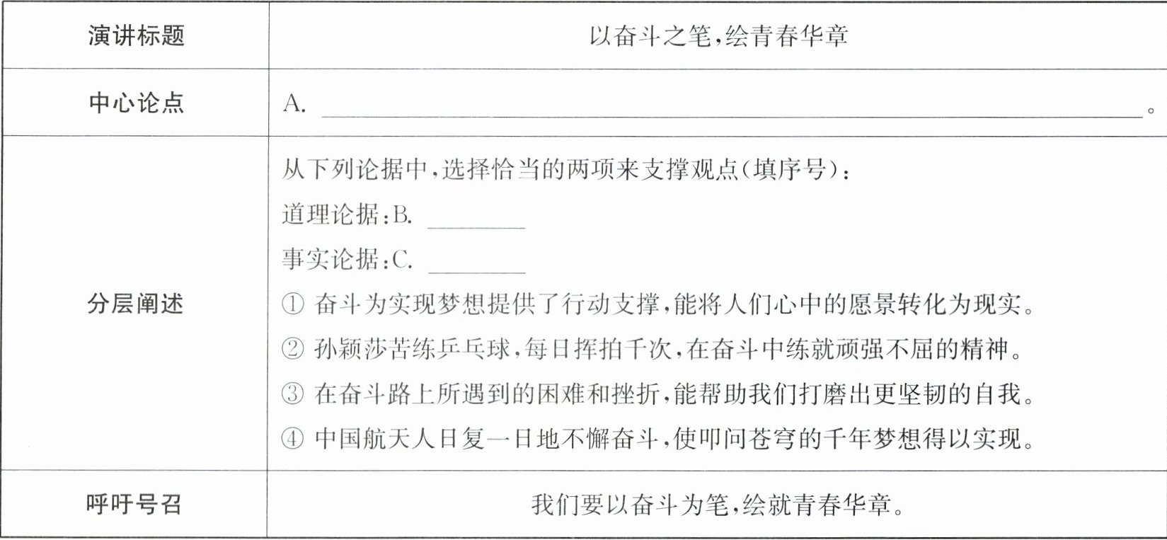 答案:2. 示例:(1) 豪情壮志谱新篇 (2) A. 青春恰逢盛世,唯有以奋斗为底色,方能书写无愧于时代的青春篇章 B. ① 解析:道理论据,①句从理论层面阐释了奋斗的意义——将梦想转化为现实,直接呼应“青春逢盛世,奋斗正当时”的主题,为“以奋斗之笔,绘青春华章”提供了逻辑支撑,属于道理论据。 C. ④ 解析:④句以中国航天人通过不懈奋斗实现“叩问苍穹”梦想的具体事例,用现实成果印证了奋斗的价值,与中心论点相契合,属于事实论据。 (3) 宋老师,您好!我们演讲社准备于 5 月 19 日下午 3 点在学校报告厅举行以“青春逢盛世,奋斗正当时”为主题的演讲比赛,想邀请您担任评委,不知您是否有空?