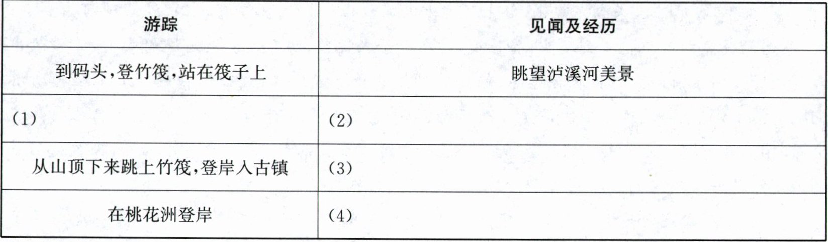 11. [内容提要]文章详细记述了作者第三次游龙虎山的过程。请你摘录文中表明作者游踪的词句并概括作者的见闻及经历,补全下面的表格。(每空15字以内)(4分)