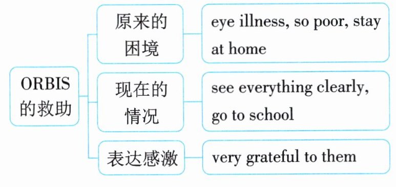 本文是关于ORBIS救助失明学生的故事。短文以第一人称叙述过去的事情,故要用一般过去时。在写作过程中要注意逻辑性,表达要清晰,同时要表达出感激之情。