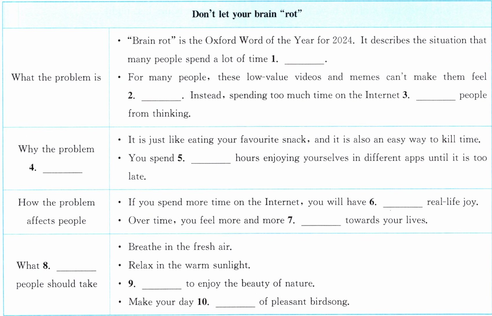 Let's be honest. What do you usually use the Internet for? For many people (not just Chinese people), it's mainly used to watch short videos and to check out new memes(表情包). Instead of helping you relax, these low - value videos and memes make it difficult for you to think. The Oxford Word of the Year for 2024, “brain rot(脑腐)”, best describes this global problem.
