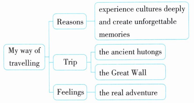 (2025·苏州市吴中区期中) 随着网络和人工智能的不断进步,如今旅游有了两种热门选择:“云游 Online tours”和“亲历 In-person travel”。“云游”借助网络,让我们足不出户就能饱览世界各地的美景;而“亲历”则是亲身前往心仪之地,感受当地的风土人情。这两种方式各有魅力,你更倾向于哪一种呢?请以“My way of travelling”为题,写一篇英语短文。
