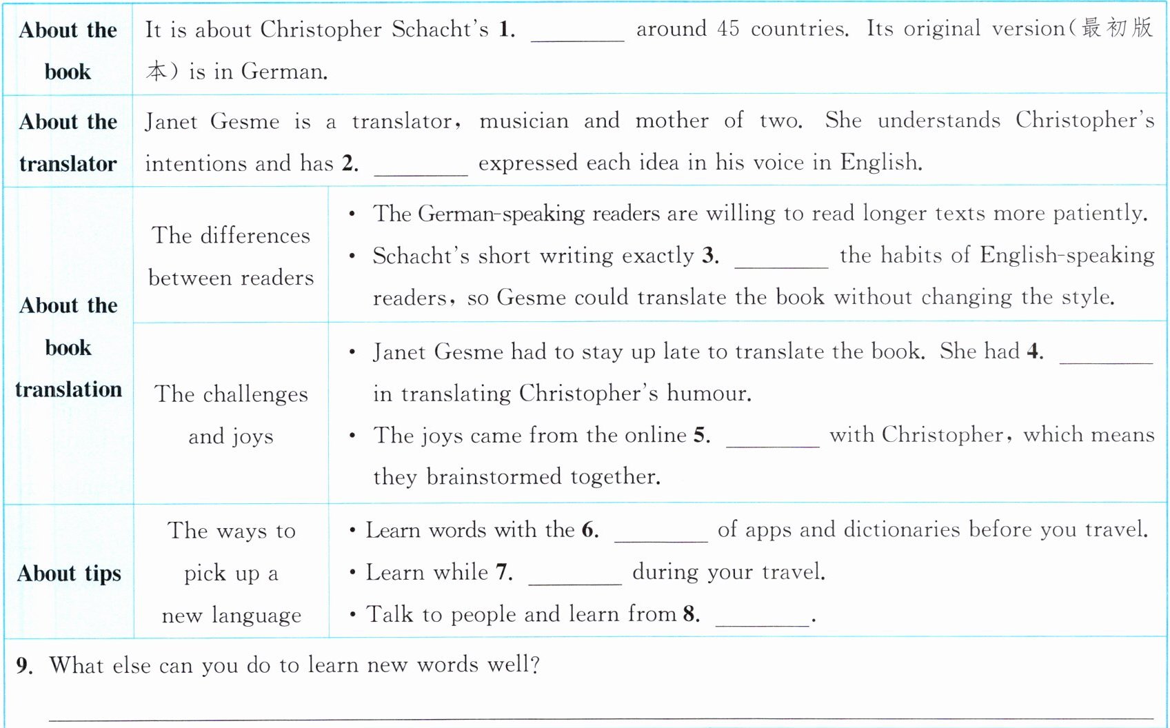 答案:1. travel/journey 2. successfully 3. matched 4. difficulty/trouble/problems 5. communication 6. help 7. waiting 8. mistakes 9. We can watch movies or TV shows in the new language.(言之有理即可)