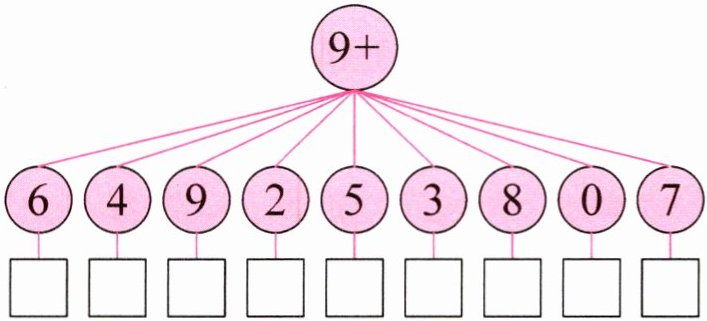 7. 把1,2,3,4,9填入空格里,使横行、竖行的3个数相加都得14。