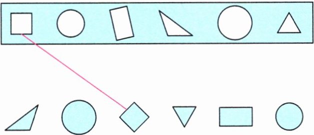 2. 从下面的彩纸上分别挖下一些图形,照样子连一连。