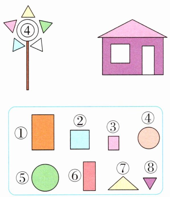 1. 选择合适的图形贴在空白位置,照样子标序号。