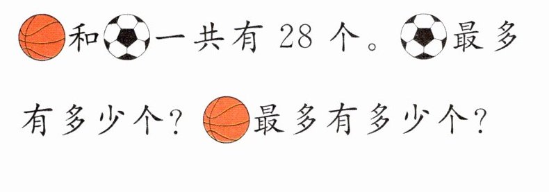 答案:5. 足球最多:28-3=25(个) 篮球最多:28-2=26(个)