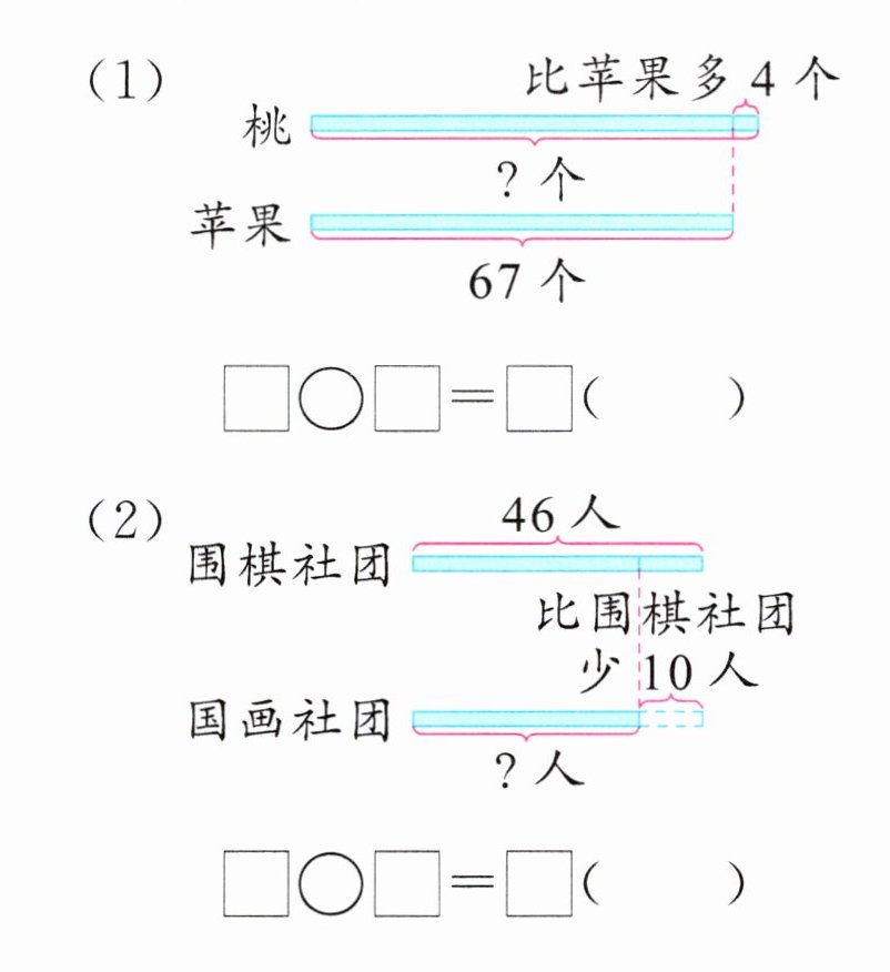 答案:2. (1) 67+4=71(个) (2) 46-10=36(人)
