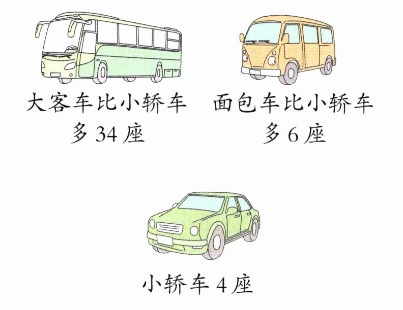 答案:12. (1)4+34=38(个) (2)4+6=10(个) 38−10=28(个)或34−6=28(个) 解析 可以先求出面包车的座位数,再与第(1)问中求出的大客车的座位数进行比较;也可以根据大客车比小轿车多34座,而面包车只比小轿车多了6座,得出面包车的座位数比大客车少34−6=28(个)。