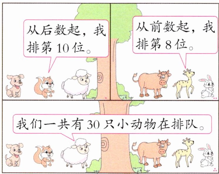 )只小动物。答案:5. 12 解析 一共有30只小动物在排队,从前数起,小鹿排第8位,则小鹿后面有30-8=22(只)小动物,从后数起,小鹿排第22+1=23(位),所以从第1只到小鹿的23只小动物中减去从第1只到松鼠的10只小动物,再减去小鹿,就是松鼠和小鹿之间的小动物,有23-10-1=12(只)。