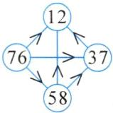 解析.观察题图中“>”和“<”的朝向,尖尖朝向小的数,开口朝向大的数,最上面圆圈对着的都是尖尖,所以只能填最小的数12;左边的圆圈对着的都是开口,所以只能填最大的数76;右边圆圈里的数要小于最下面圆圈里的数,所以剩下的37和58中,37填在右边的圆圈里,58填在最下面的圆圈里。