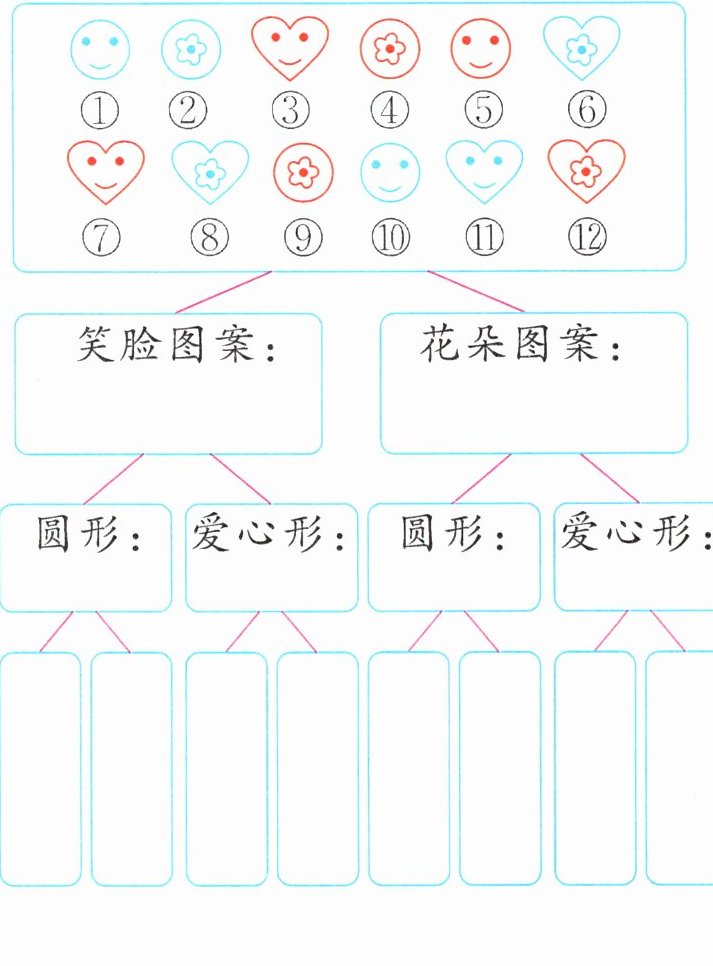 答案:笑脸图案:①③⑤⑦⑩⑪;花朵图案:②④⑥⑧⑨⑫;圆形(笑脸):①⑤⑩;爱心形(笑脸):③⑦⑪;圆形(花朵):②④⑨;爱心形(花朵):⑥⑧⑫