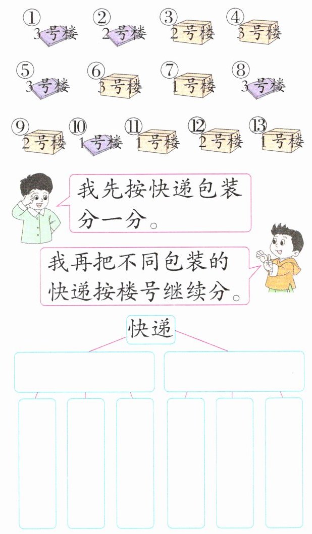 2. 新情境 真实生活 要想知道每种快递包装中 1,2,3 号楼分别有几个,可以怎么做?