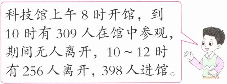 3. 科技馆上午8时开馆,到10时有309人在馆中参观,期间无人离开,10~12时有256人离开,398人进馆。