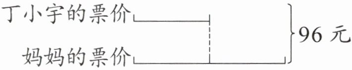 从线段图中可以看出,把丁小宇的火车票票价看作 1 份,妈妈的火车票票价就是这样的 2 份,96 元里一共包含这样的 $1 + 2 = 3$(份),求丁小宇的火车票票价是多少元,就是把 96 元平均分成 3 份,求每份是多少,用除法计算。