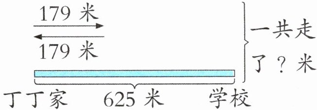 丁丁走了179米后又返回家中,来回一共走了2个179米,然后从家到学校又走了625米,把三段路的路程相加就是他今天上学一共走的路程。