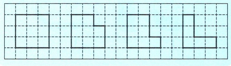 思路分析 观察可知,四个图形都是由 12 条小正方形的边围成的。从左边开始,数每个图形包含的小正方形个数,第一个图形包含 9 个小正方形,第二个图形包含 8 个小正方形,第三个图形包含 7 个小正方形,第四个图形包含 5 个小正方形,所以它们包含的小正方形个数不同。