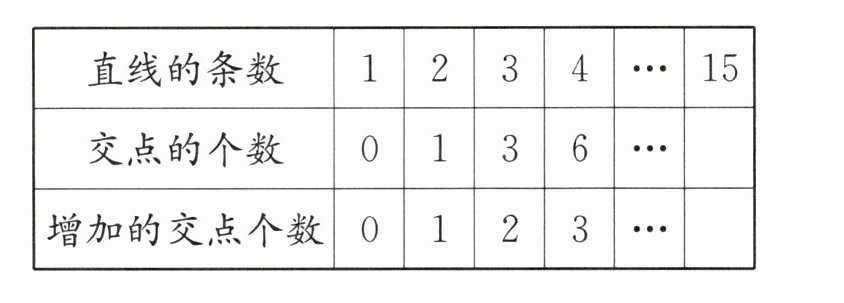 7. 新趋势 推导探究 在同一平面内有 15 条直线,这些直线最多能形成多少个交点?把下表填写完整。