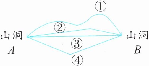 5. 亮点原创·小朋友到公园进行“寻宝”游戏。从山洞 A 到山洞 B 去寻宝,有 4 条路可以走,你知道走哪条路最近吗?为什么?